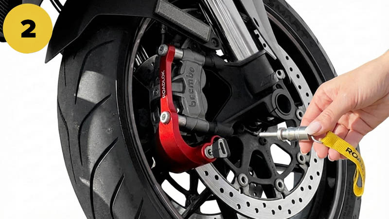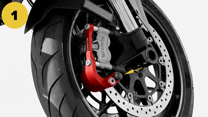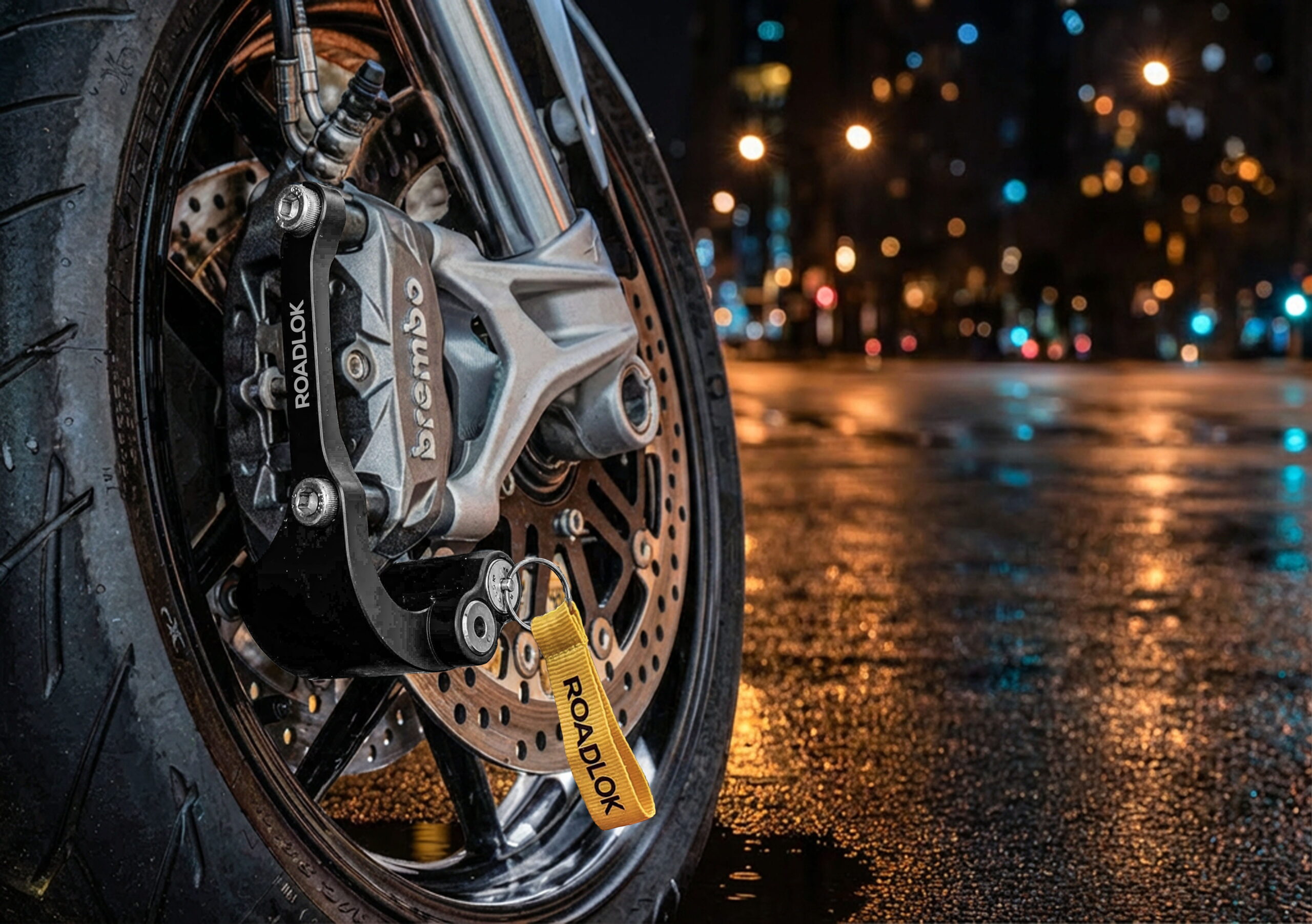 De ROADLOK werkt anders dan alle andere motorsloten op de markt. In tegenstelling tot traditionele schijfremsloten wordt ons systeem op de voorremklauw gemonteerd en blijft het daar zitten terwijl u rijdt.